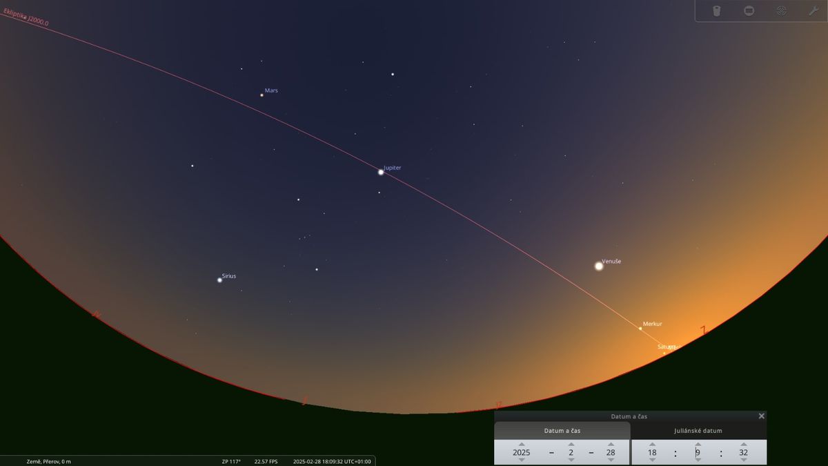 V sobotu 1. března se ke konstelaci připojí i mladý Měsíc, zatímco Saturn se naopak stane již nepozorovatelným.