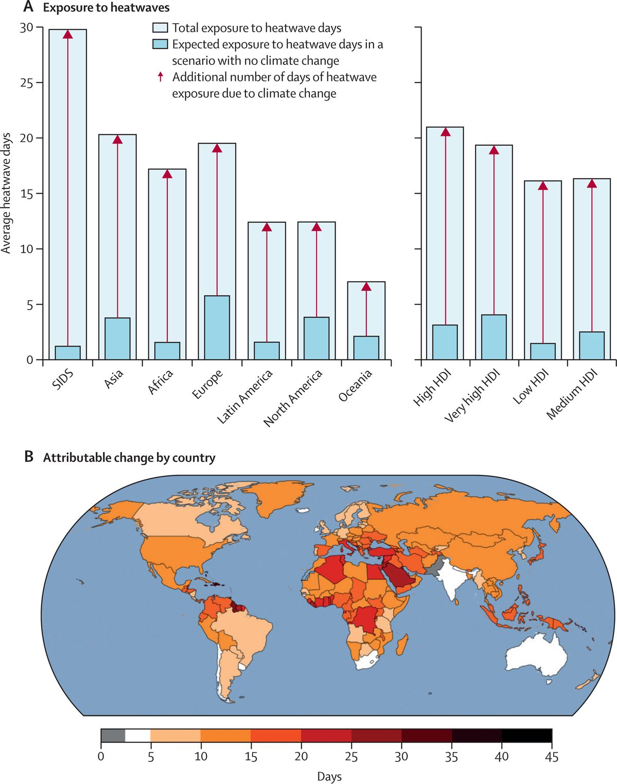 Obrázek A zobrazuje průměrný počet dnů s vlnou veder v letech 2020–24 podle regionu (SIDS = malé ostrovní státy) a životní úrovně (podle indexu HDI). Červené šipky označují počet dnů s vlnou veder, které přibyly v důsledku změny klimatu. Na obrázku B je příspěvek klimatické změny ukázán pro každou zemi.