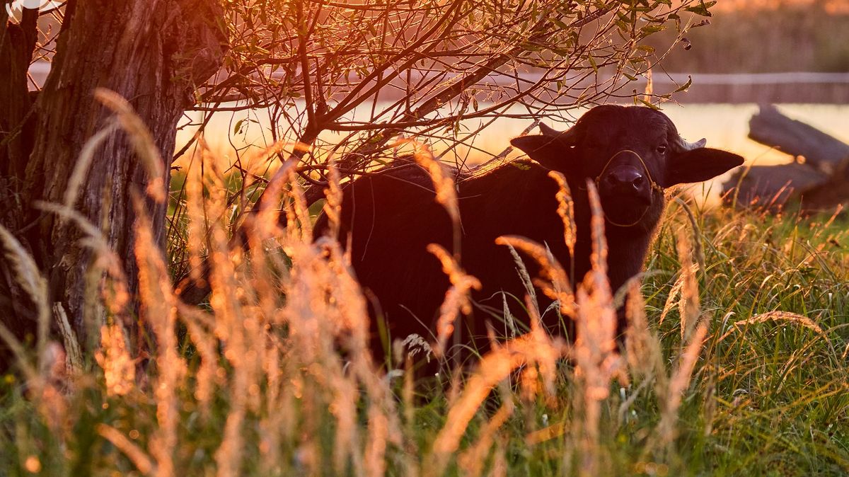 Vodní buvoli jsou nepřehlédnutelní svým vzhledem. Pasou se na loukách vymezených elektrickým ohradníkem.