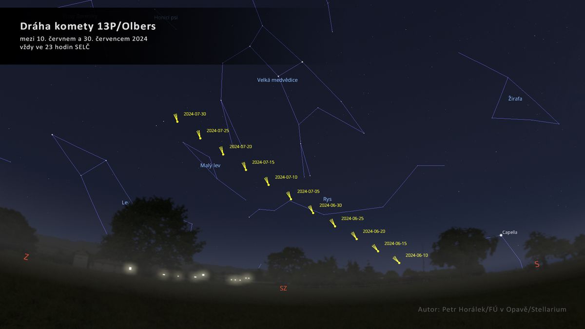 Dráha komety 13P/Olbers mezi 10. červnem a 30. červencem 2024 nad severozápadním obzorem. Na spatření komety potřebujete malý dalekohled.