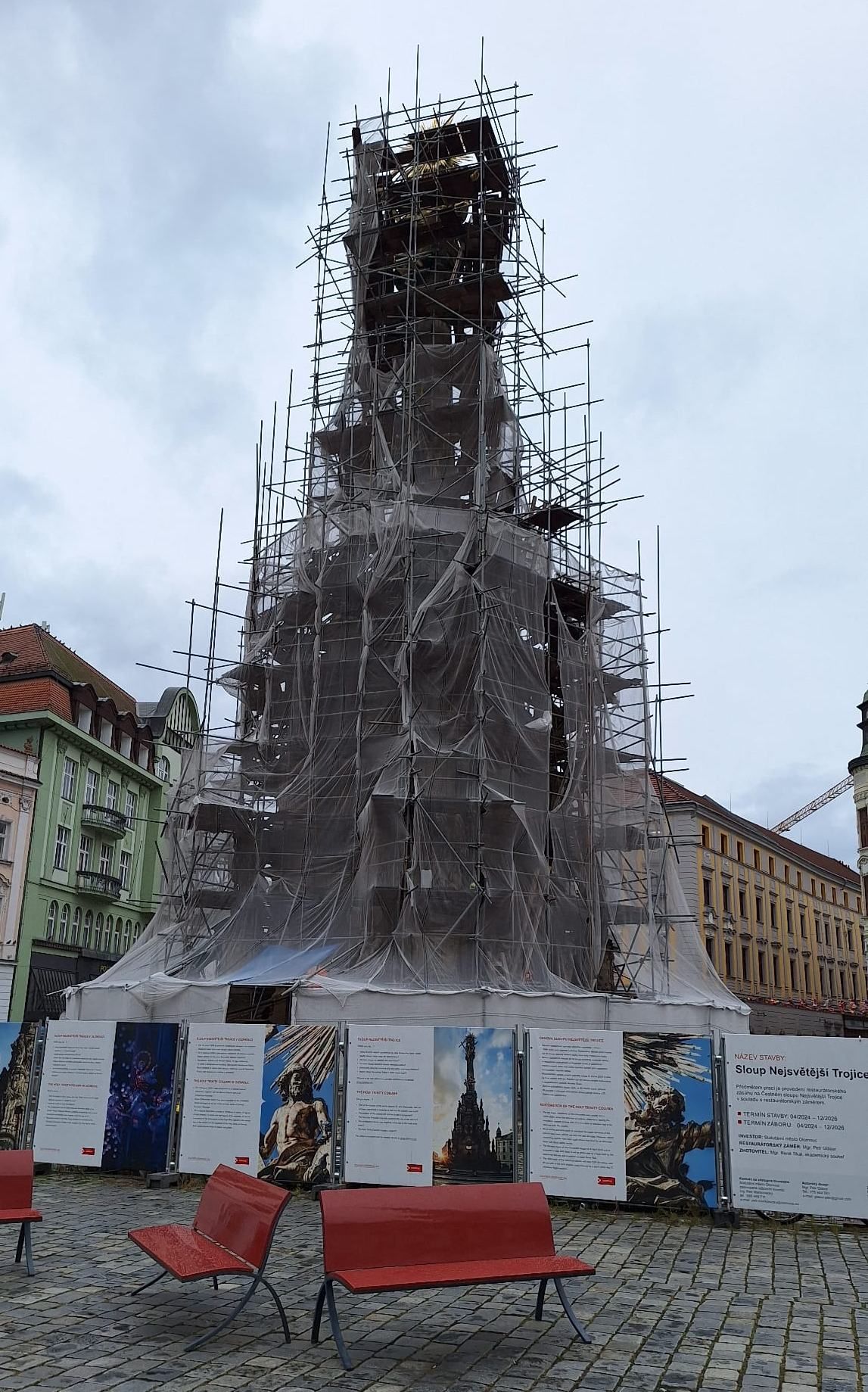 Sloup Nejsvětější Trojice je momentálně obehnán lešením.
