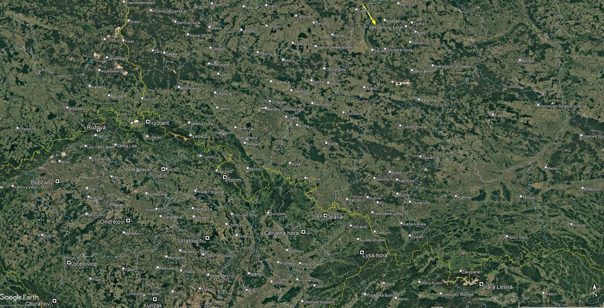 V atmosféře uletělo těleso meziplanetární hmoty téměř 75 km světelné dráhy, celá dráha ležela západně od polského města Lodž.