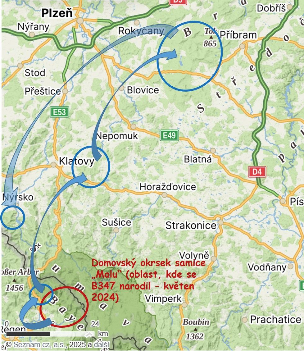Dvouletý samec zatím nemá jméno, a tak ho odborníci označují jako B347. „Ještě jsme mu ho nestihli dát, protože pořád cestuje a dosud se neusadil,“ vysvětlila Mináriková.