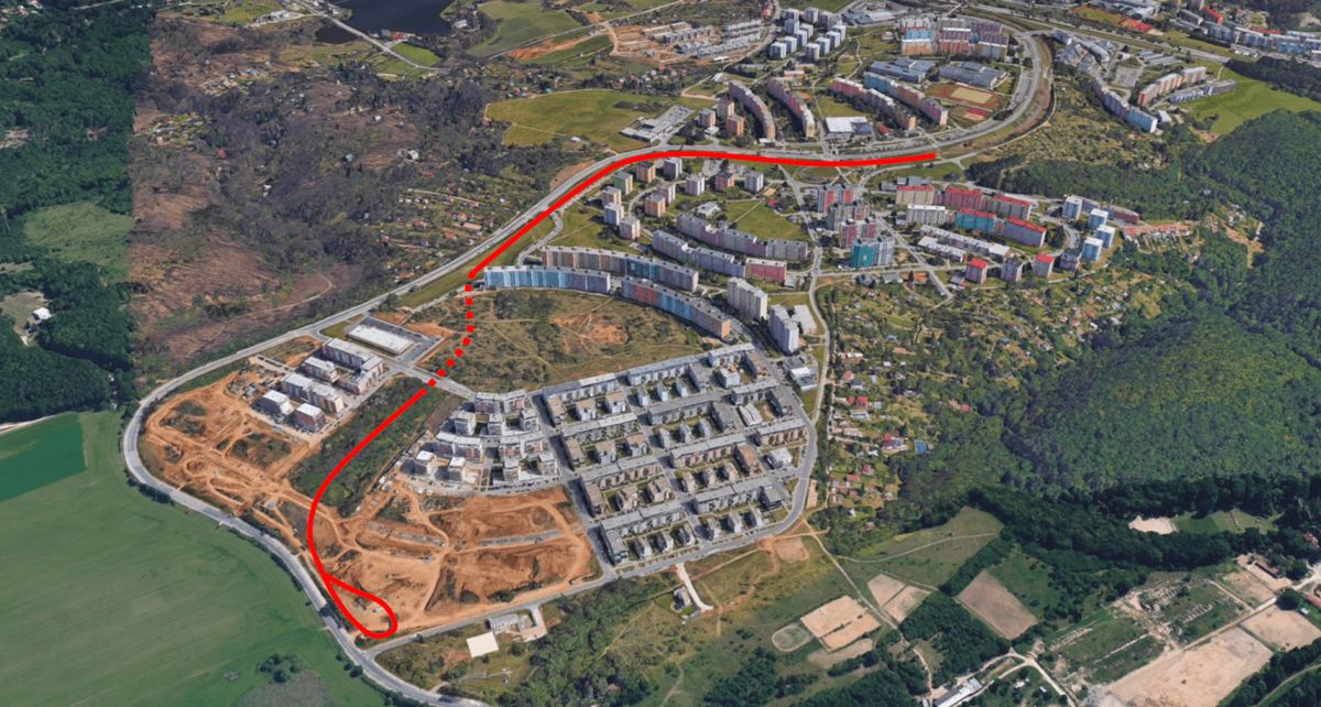 Červeně je vyznačeno prodloužení tramvajová trati do brněnské čtvrti Kamechy.