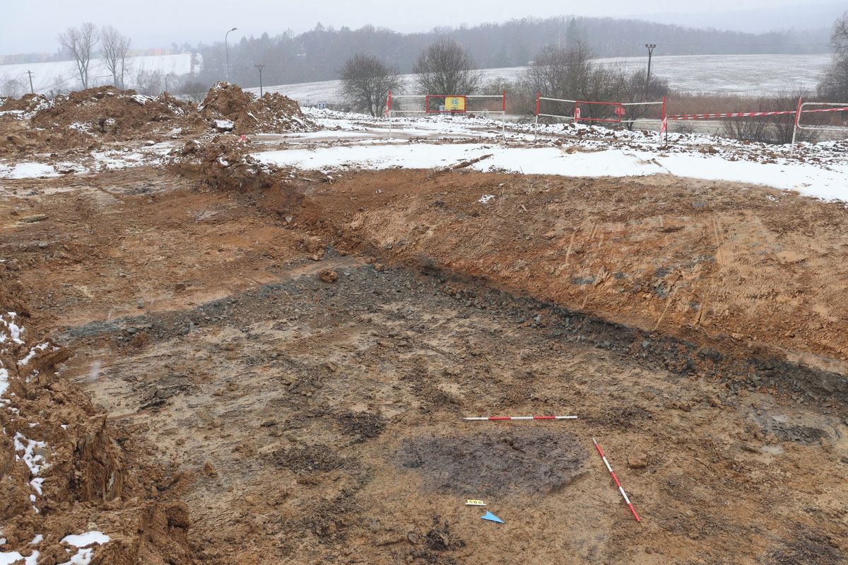 Ve výkopu pro budoucí retenční nádrž se pod navážkami v hloubce dvou metrů podařilo vykopat tmavou výplň menší pravěké jámy o rozměrech zhruba 2 x 1,5 metru.