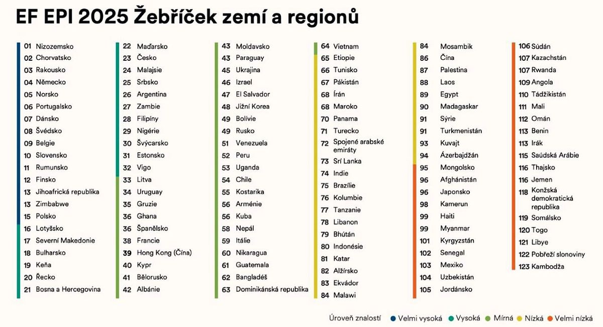 Celosvětový žebříček úrovně znalostí angličtiny pro rok 2025.