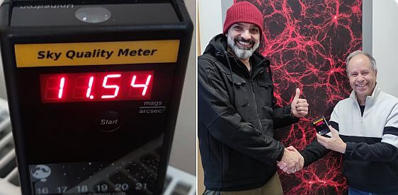 Měřicí přístroj Sky Quality Meter (foto vlevo) byl na Astronomickém ústavu AV ČR Pavlem Suchanem (na druhé fotce vpravo) předán výzkumníkovi Matyáši Šandovi (vlevo).