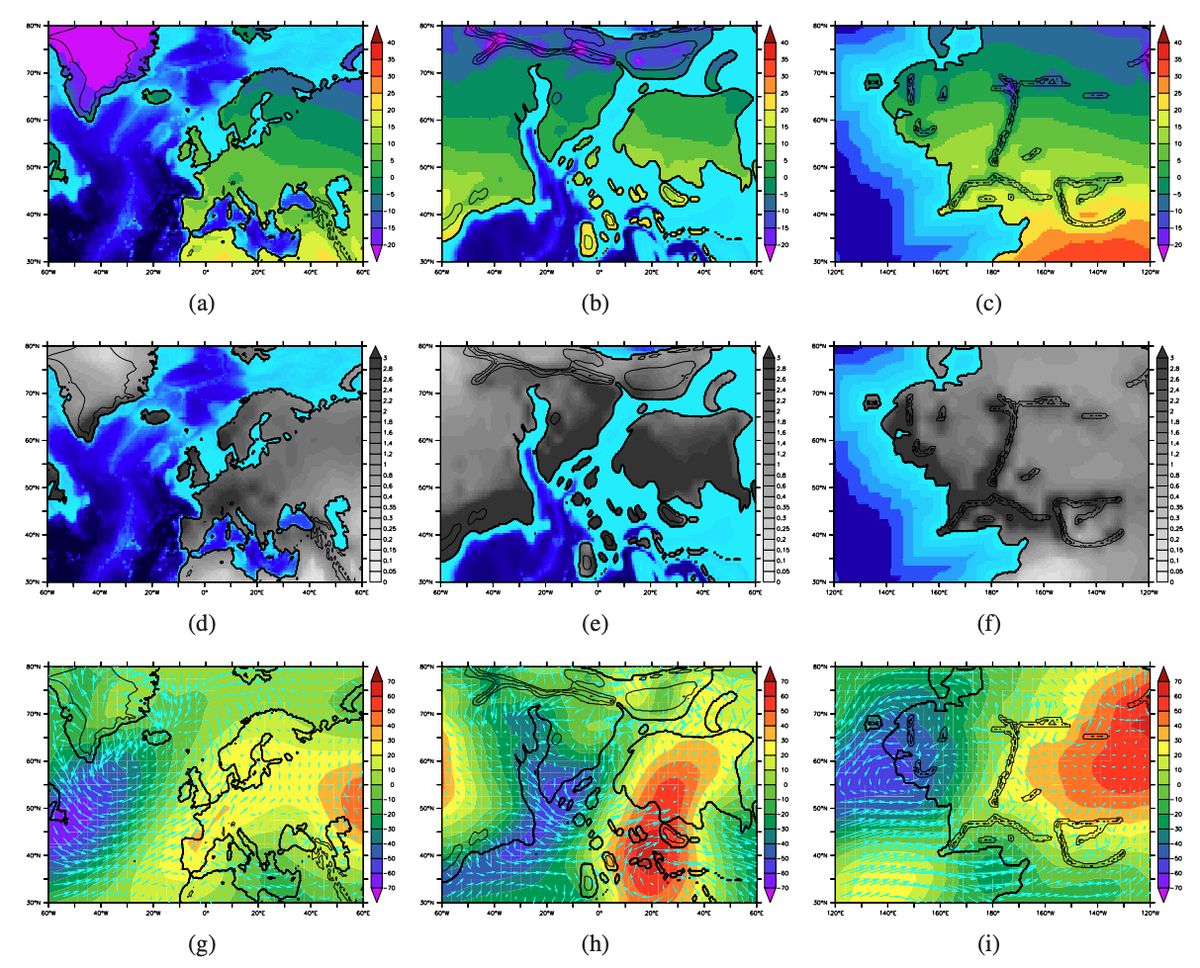 Porovnání modelované roční průměrné teploty (a, b, c), srážek (d, e, f) a povrchových větrů a tlaku ve střední atmosféře (g, h, i) v západní Evropě (vlevo), křídovém Severním Atlantiku (uprostřed) a Středozemi (vpravo)