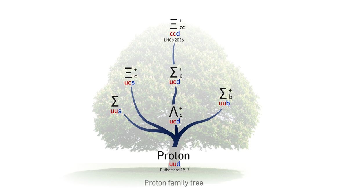 Ilustrační znázornění „rodokmenu protonů“, které ukazuje, jak z protonu vznikají další částice nahrazením jeho kvarků kvarky typu strange (s), charm (c) nebo bottom (b). Nově objevená částice Ξcc⁺ se nachází na vrcholu.