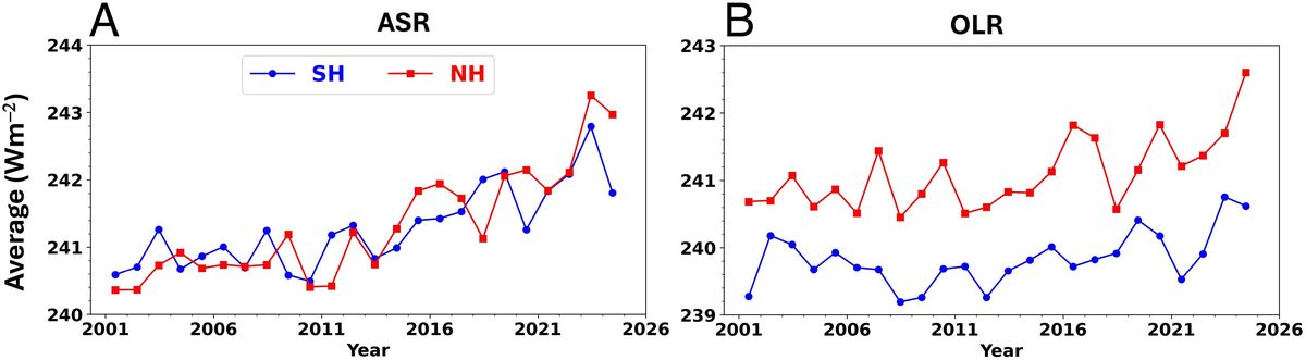 Roční průměrné hodnoty (A) pohlceného a (B) odraženého záření na severní (červeně) a jižní (modře) polokouli v letech 2001-2024
