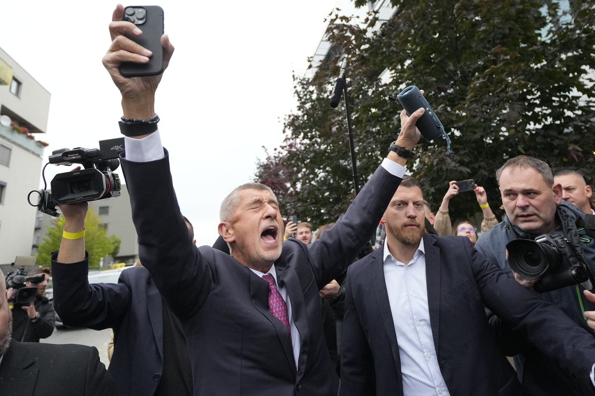 „To je náš song!“ mává Andrej Babiš s reprákem před volebním štábem hnutí ANO na pražském Chodově.