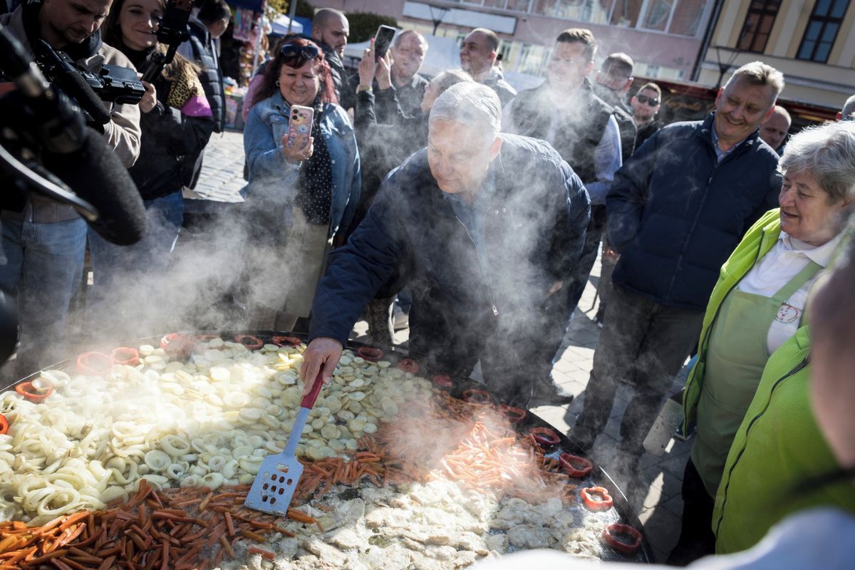 Viktor Orbán pomáhá s přípravou jídla na trhu ve městě Balassagyarmat