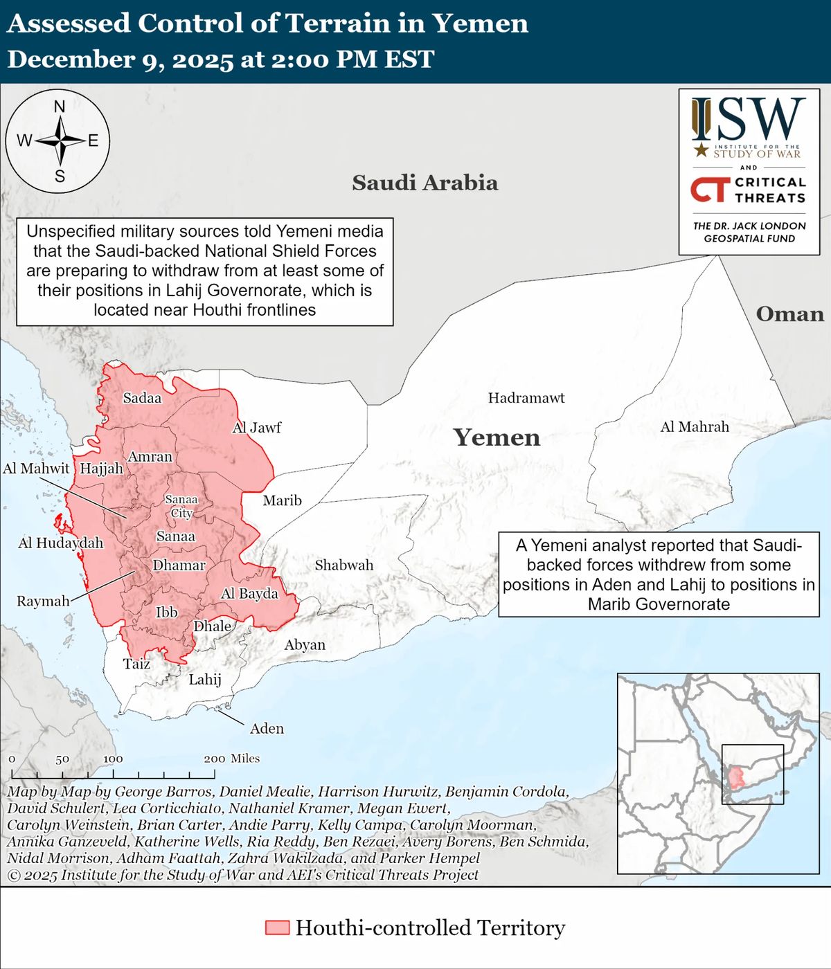 Jemenský analytik uvedl, že se Saúdy podporované síly už stáhly z Adenu a Lahidže na pozice v guvernorátu Marib ve střední části Jemenu. Marib je kontrolován dalším viceprezidentem PLC Sultanem al-Aradou. Ten hraje klíčovou roli v jemenské vládě a při obraně Maribu před útoky Húsíů, neboť se mu podařilo proti šíitským vzbouřencům spojit různé komunity a kmeny.
