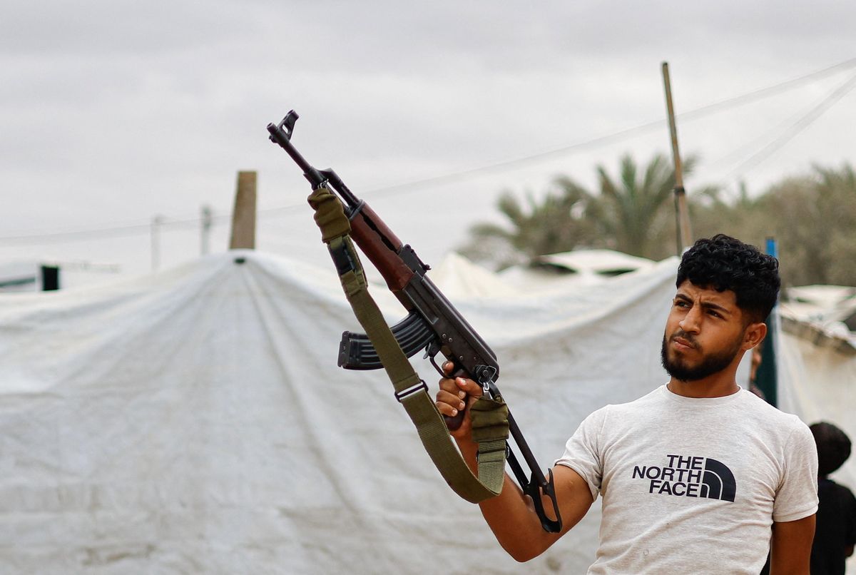 Palestinský muž v centrální části Pásma Gazy míří zbraní do vzduchu v reakci na oznámení amerického prezidenta Donalda Trumpa, že se Izrael a Hamás dohodly na první fázi příměří v Gaze.