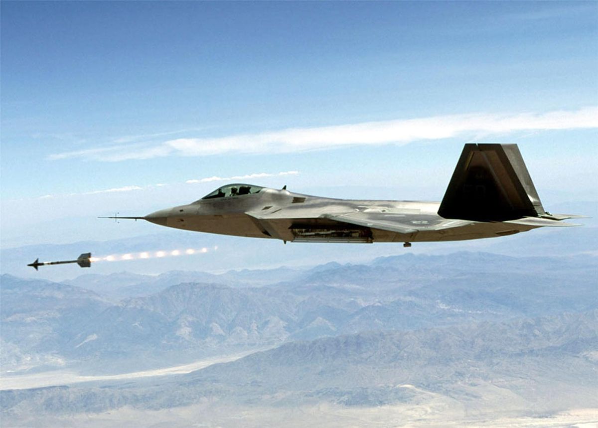 Americký letoun F-22 Raptor právě odpálil raketu AIM-9 Sidewinder