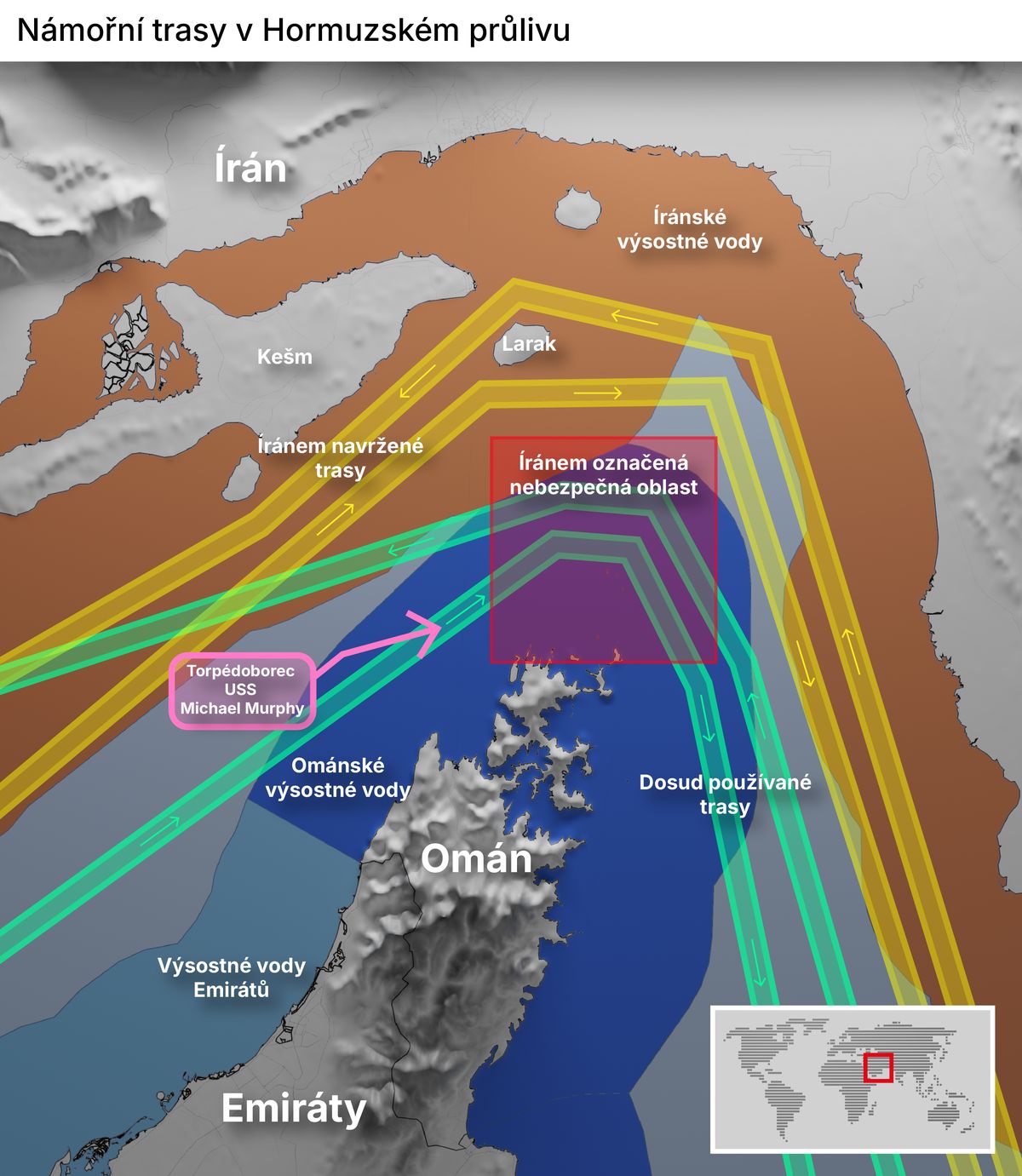 Írán nakladl do průlivu námořní miny. Jejich počet není znám. Chce, aby lodě pluly severnější trasou kousek od ostrova Kešm a jedním směrem dokonce i mezi ostrovy Kešm a Larak. Protože by pluly v jeho výsostných vodách, mohl by je kontrolovat a vybírat za použití cesty poplatky.
