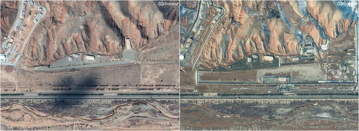 Satelitní snímky z října 2024 (vlevo) a letošního ledna (vpravo) ukazují, jak Íránci pokročili v pracích u jaderného areálu Parchin.