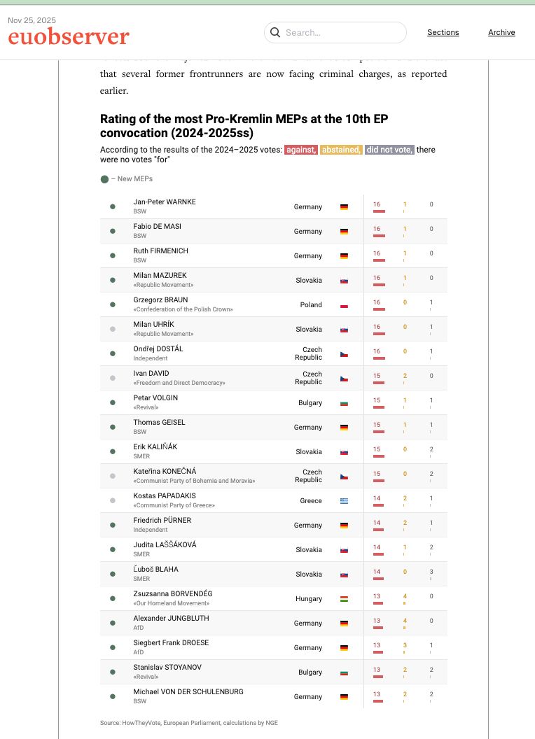 Nejvíce proruskými se na dělené první pozici umístili tři němečtí europoslanci BSW, tedy proruské strany Spojenectví Sahry Wagenknechtové, a jeden slovenský, Milan Mazurek z ultranacionalistického hnutí Republika.