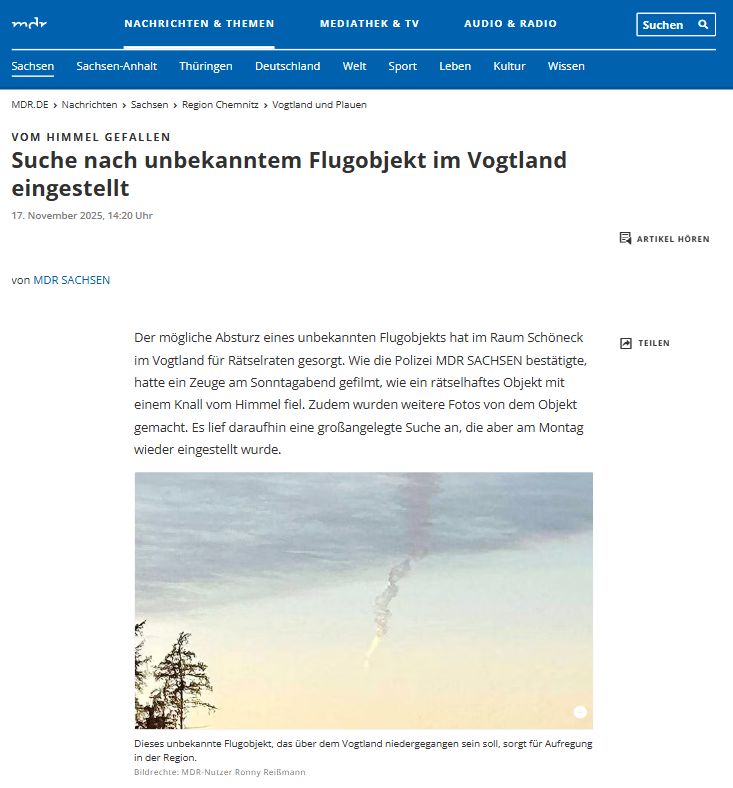 Zatím však bezúspěšně, nikdo nehlásil případný požár po pádu objektu, neví o něm nic ani řízení letového provozu z Lipska, meteorologové ani Bundeswehr.