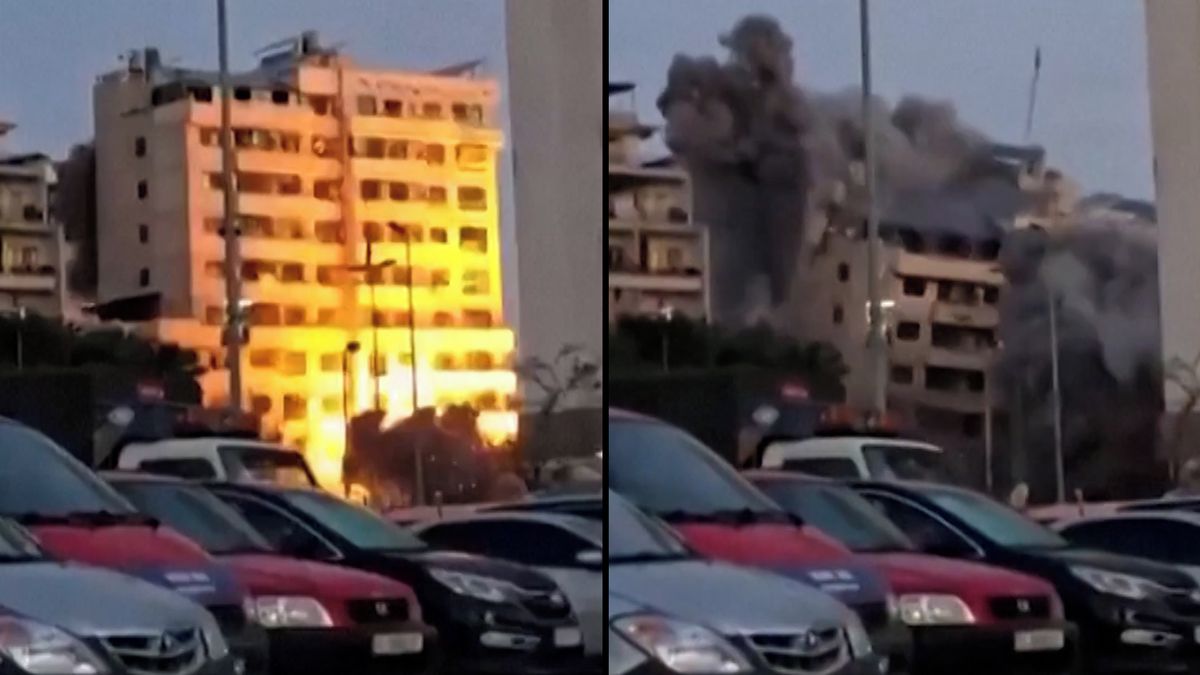 Kamera zachytila, jak se po zásahu izraelskou střelou zřítil k zemi mnohapatrový dům v BejrútuVideo: Reuters
