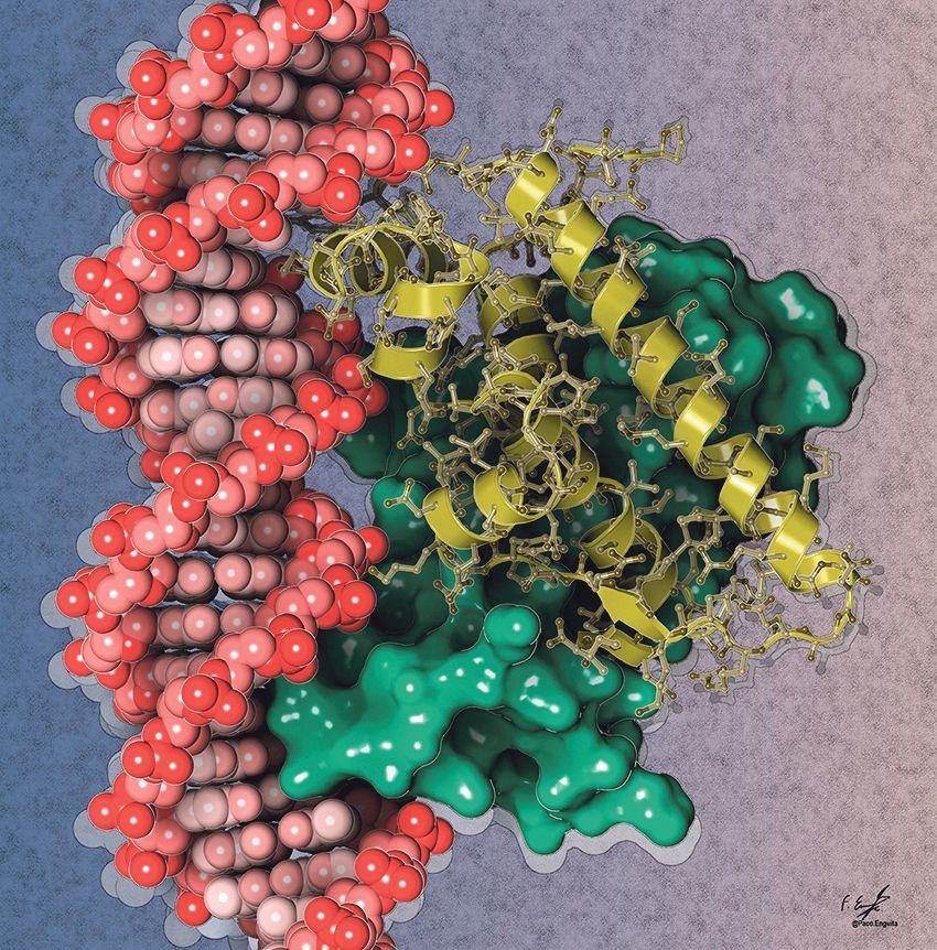 Znázornění CRISPR (zelená), vázaného na syntetickou molekulu DNA (červená)