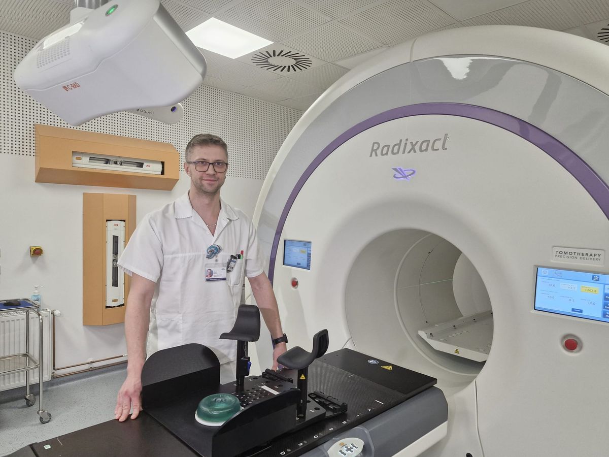 Radiologický asistent s vysokoškolskou kvalifikací Radek Tejkl ve VFN stojí po boku zařízení Radixact X9, kde obsluhuje pacienty s nádorovým onemocněním.