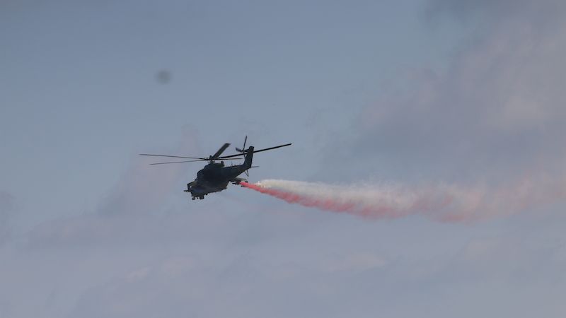 Slavnostní průlet vrtulníku s trikolorou nad Mošnovem