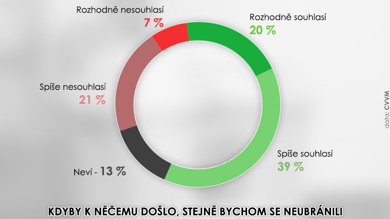 Pouze šest procent dotázaných si myslí, že suverenitu státu není třeba bránit za každou cenu, zatímco 89 procent lidí si myslí opak. Současně ovšem 59 procent Čechů pochybuje o tom, že by se země dokázala bránit, „kdyby k něčemu došlo“.