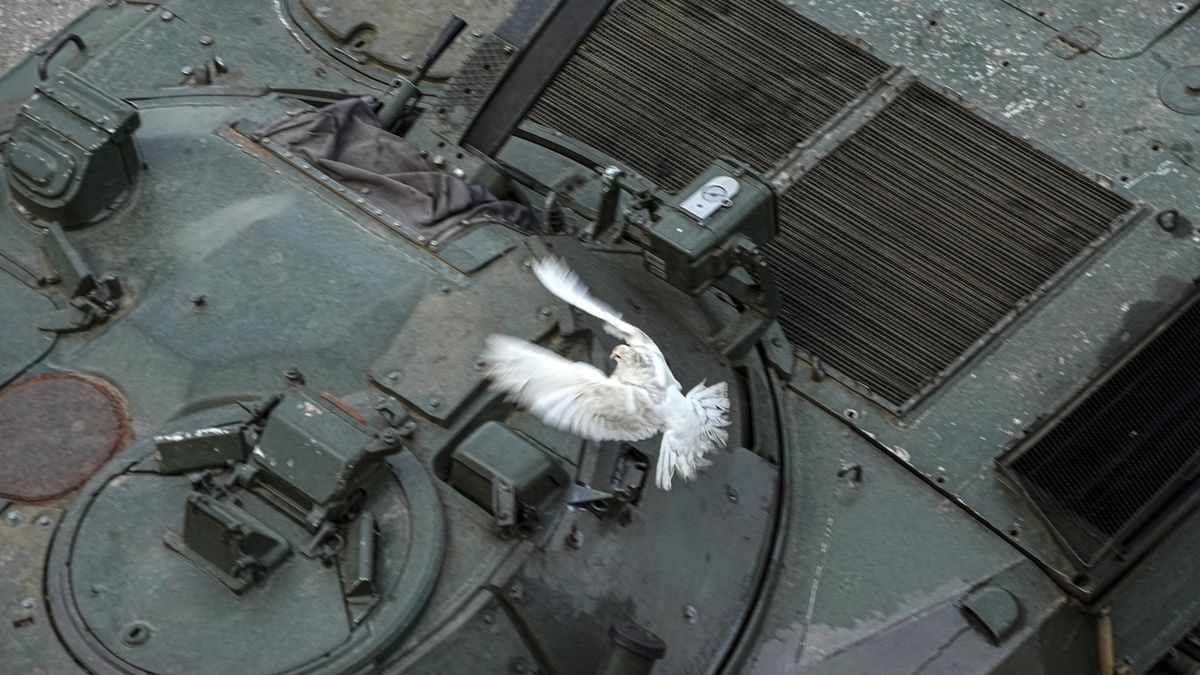 Голубь пролетает над военной машиной на выставке трофейных украинских танков в Луганской области