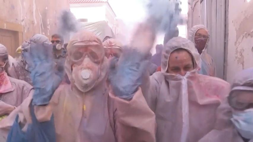Respirátory a ochranné brýle. Tradiční řecká veselice s moukou připomíná pandemii