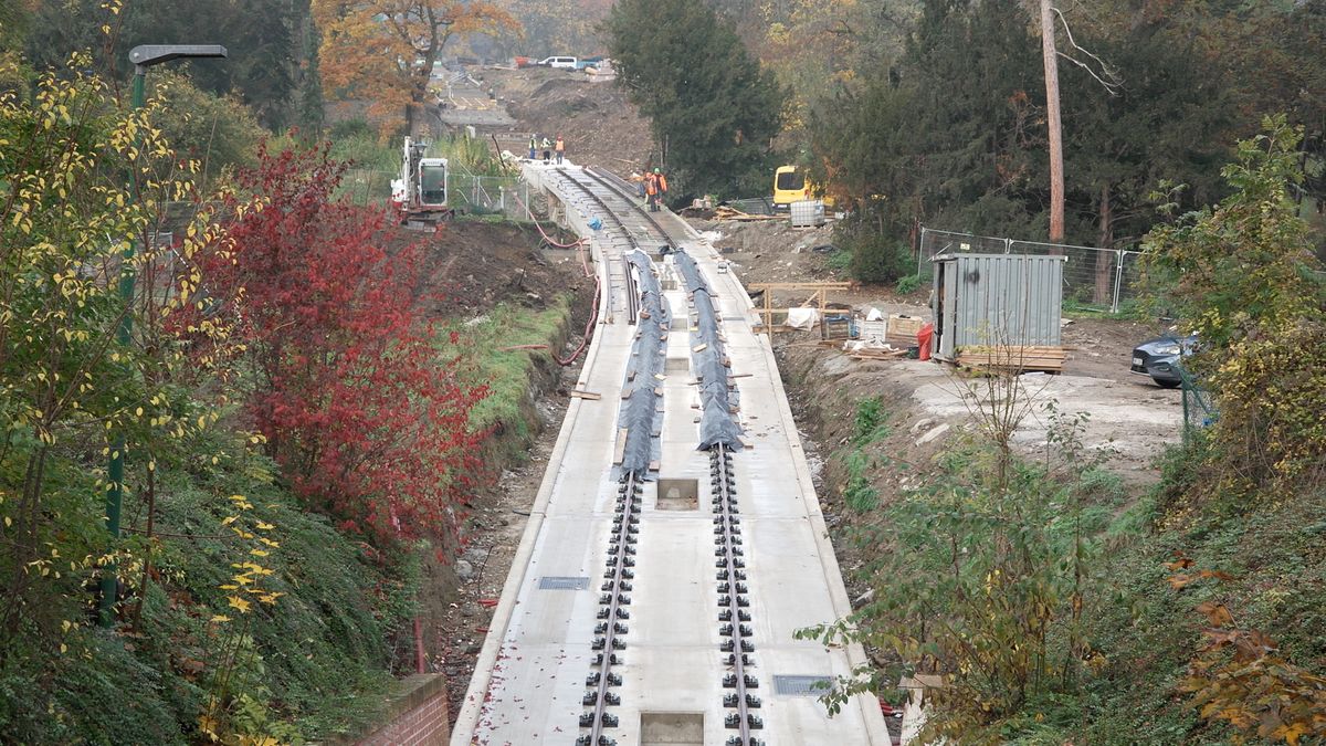 Práce na rekonstrukci petřínské lanové dráhy pokračují. Dělníci zpevnili nestabilní svah piloty, na několika místech mají hotovou železobetonovou desku...