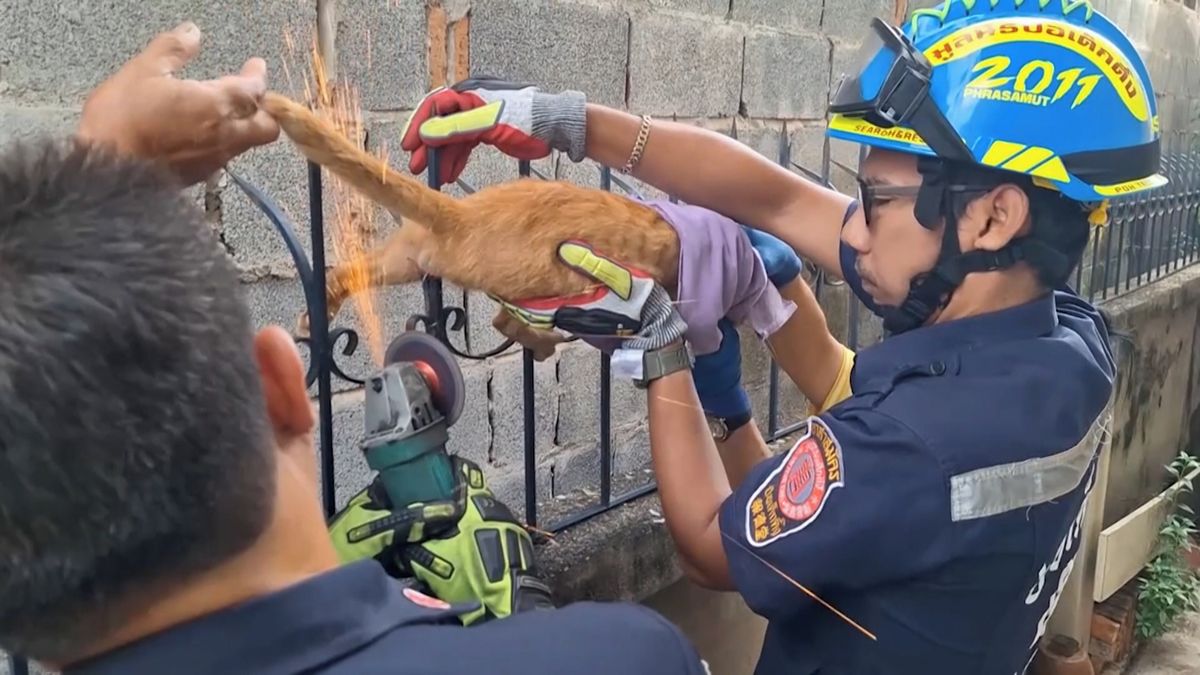 Nevšední misi podnikli záchranáři v thajském městě Samut Prakan, když pomáhali zrzavému kocourovi, který spadl ze střechy domu a nabodl se na plot. Ostrý hrot...