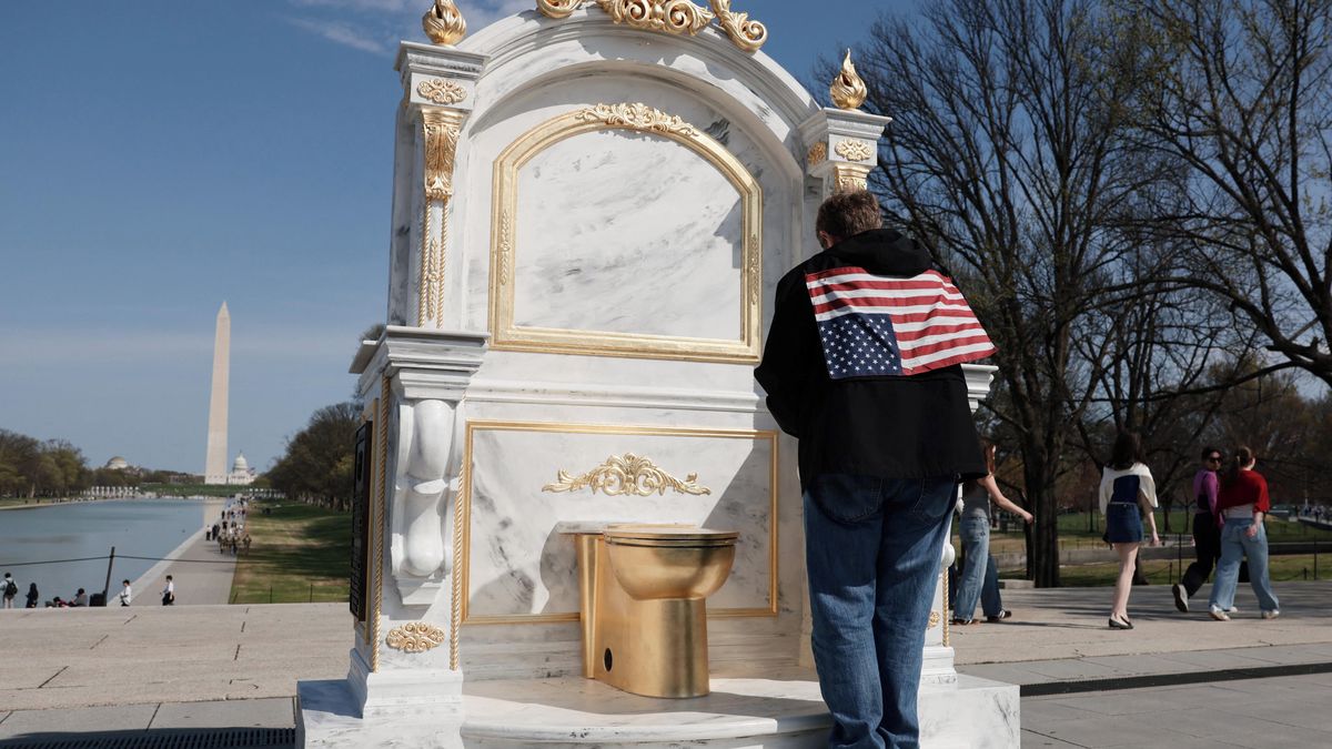 Poblíž Bílého domu se objevila maketa trůnu se zlatou toaletou. Autoři narážejí na Trumpovy rekonstrukční projekty