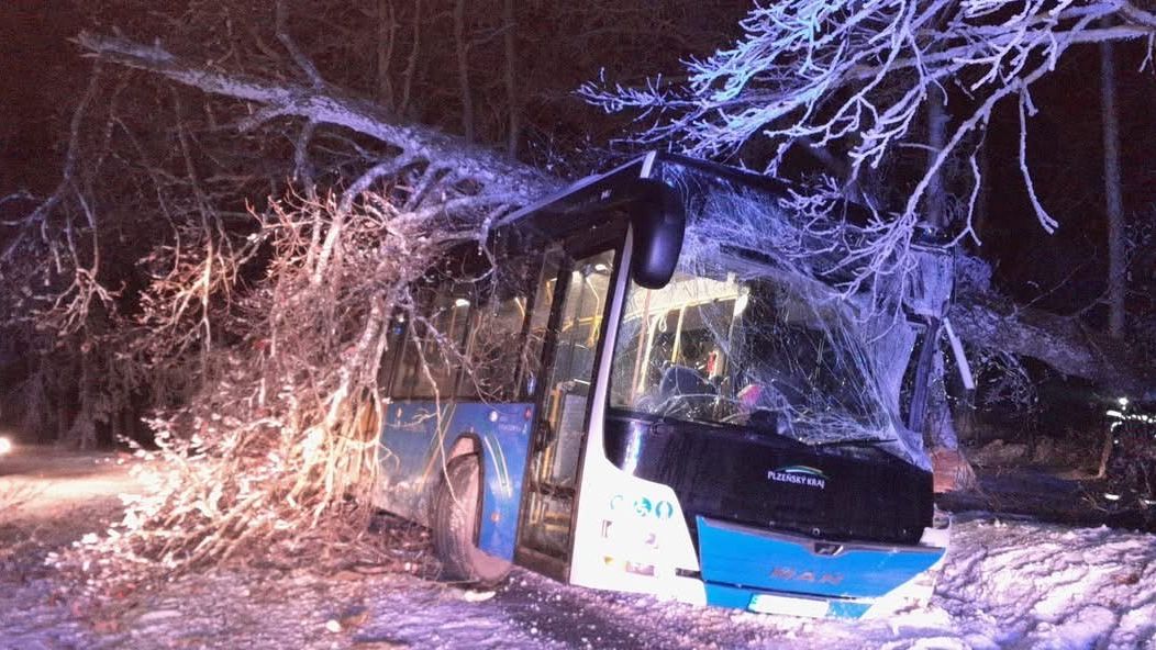 O štěstí může hovořit řidička autobusu, která v úterý ráno havarovala na severním Plzeňsku. Narazila do stromu, který se zlomil a spadl na střechu autobusu.