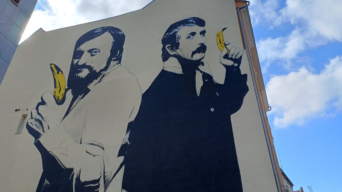 Velkoplošná malba na zdi bratislavského domu zachycuje herce Milana Lasicu a Júlia Satinského