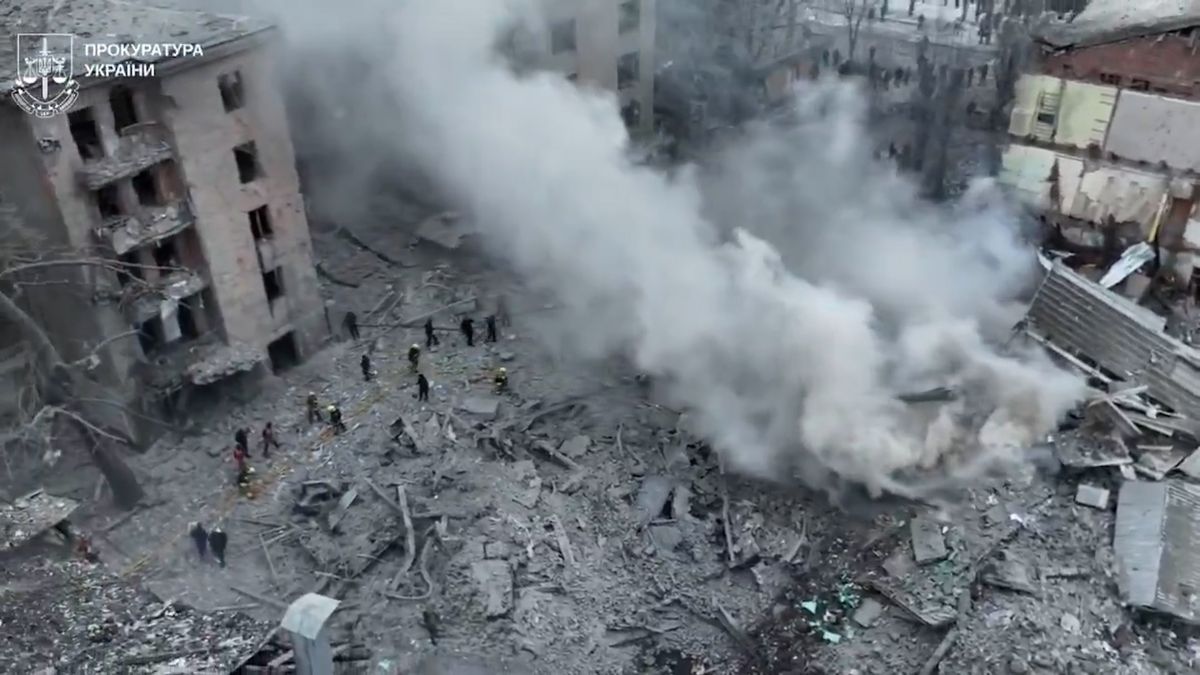 Ruský úder na obytnou výškovou budovu v Charkově. Záběry z dronu ukazují zkázu
