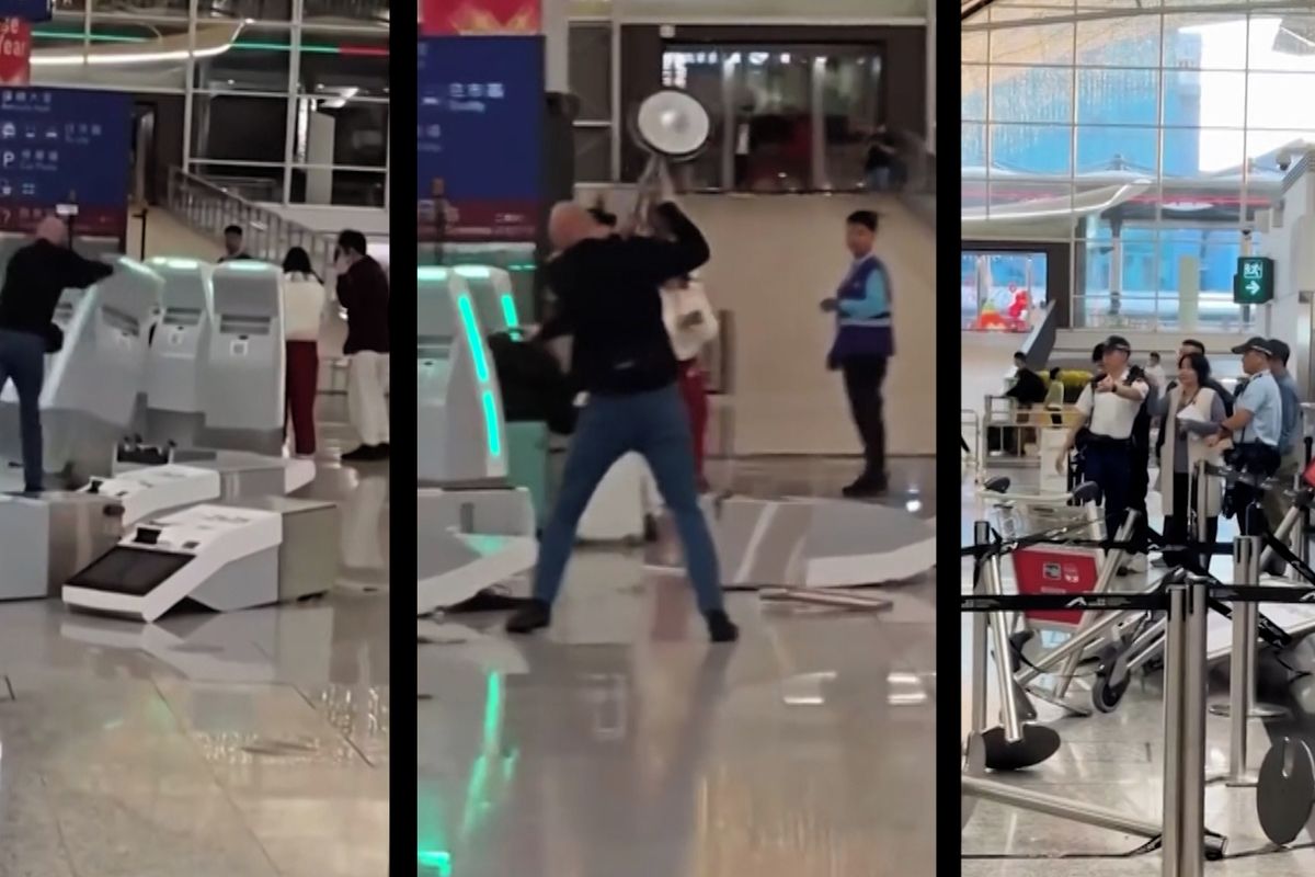 Nepochopitelný pohled se v pondělí naskytl cestujícím v odletové hale na mezinárodním letišti v Hongkongu. Holohlavý muž tam z ničeho nic začal rozbíjet...