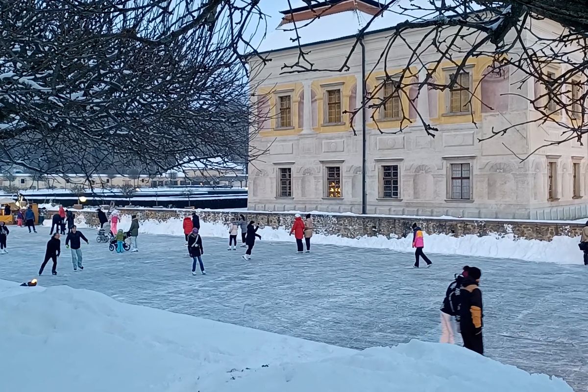 Zámecké bruslení. Zamrzlý vodní příkop na Kratochvíli se změnil v kluziště